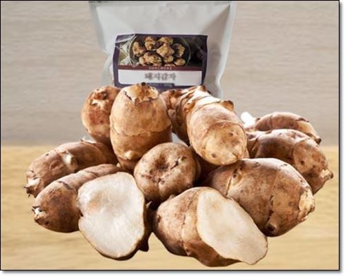 돼지감자는 국화과에 속하는 여러해살이풀로 자라는 모습이 감자와는 달리 해바라기에 가깝지만 덩이줄기 형태로 자라는 뿌리가 감자와 비슷해 돼지감자로 부르거나 뚱딴지로 부르고 있습니다. 돼지감자는 보통 말려서 차로 우려 마시거나 가루 내어 사용하는데 생으로도 먹을 수 있으며 식감이 아삭하고 단 맛이 있습니다. 또한 돼지감자는 이눌린과 식이섬유 등이 풍부하게 함유돼 있어 혈당 조절에 도움을 주고 장 건강에 도움을 주며 다이어트와 변비 해소에도 도움을 줄 수 있습니다.