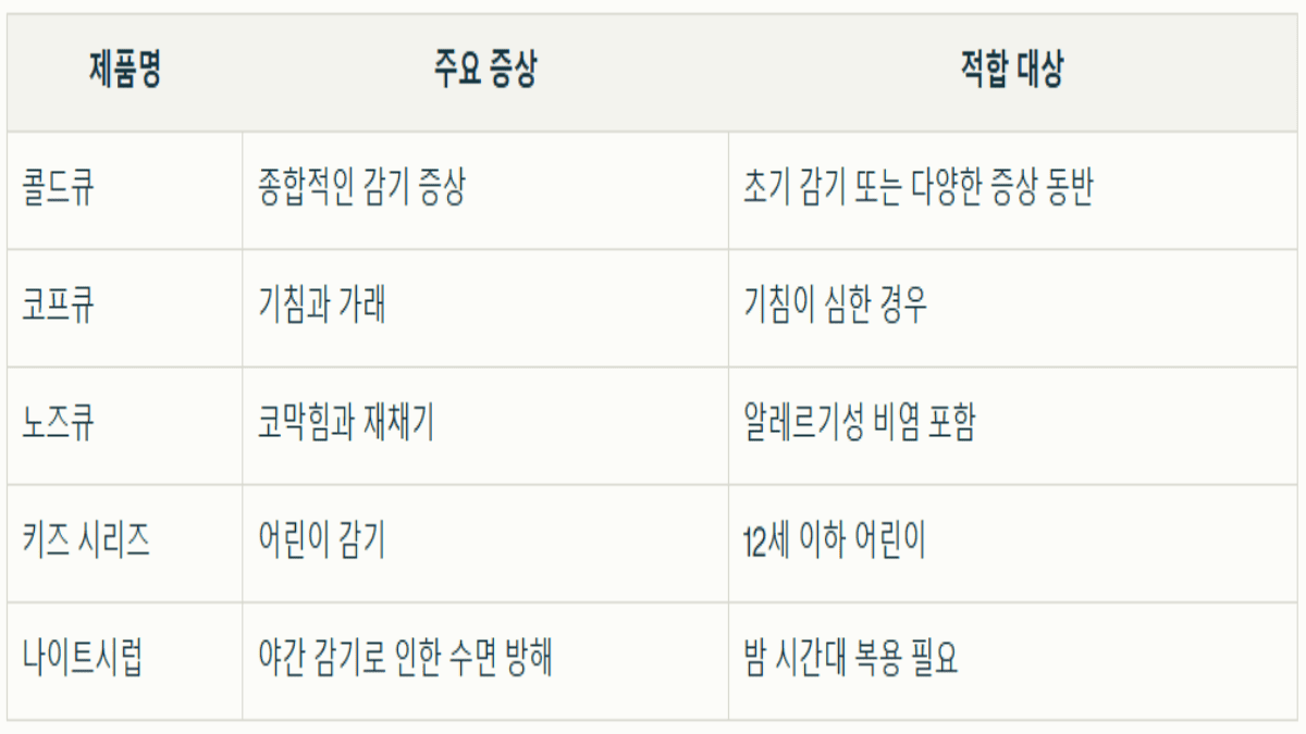 A1: 자신의 감기 증상을 먼저 확인하세요. 몸살과 발열 등 종합적인 증상이 있다면 콜드큐를 추천하며, 기침이 심하다면 코프큐를 선택하세요. 코막힘이 주된 문제라면 노즈큐가 효과적입니다.