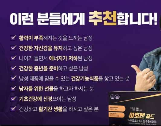 중년 남성은 과도한 업무와 스트레스로 활력 저하와 갱년기 증상을 경험할 수 있습니다. 특히 체력 저하와 무기력감은 업무와 일상생활에도 많은 영향을 미치게 되며 건강기능식품인 야호맨 골드가 효과적으로 알려져 주목받고 있습니다.